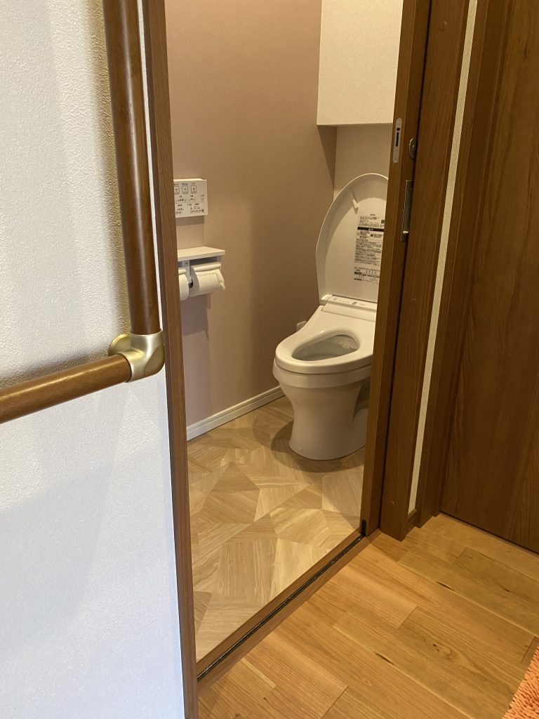 トイレの入口にあった段差をなくし、壁には手すりを設けバリアフリー化を行いました。